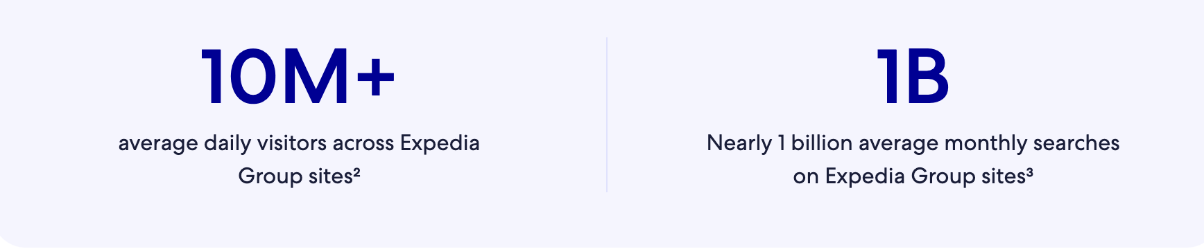 Every day, millions of high-intent consumers visit our sites ready to spend — not just on travel, but on products that enhance their lives. They're affluent, influential, and 41% more likely to buy from brands they’ve seen advertised compared to non-Expedia Group audiences. When you work with us, you’ll get digital media experts who know our audience better than anyone and can help you with strategic planning, creative development, in-depth monitoring and reporting, and campaign optimization.