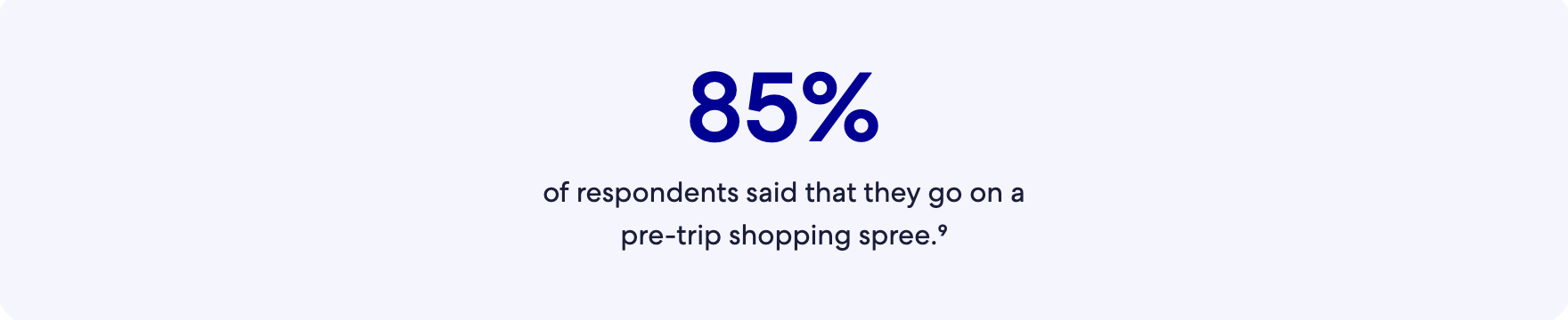 In a recent social media survey of our audience, a majority of respondents said they go on a pre-trip shopping spree, and the items they must have before leaving home include tech products like phones, portable chargers, and earbuds as well as accessories like bags, skincare, and comfortable shoes.¹⁰